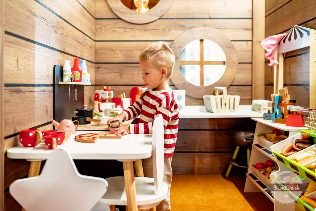Ten tvorí viac ako polovicu kaviarne a je hotovým umeleckým dielom. Drevený dizajnový kútik vyrobený na mieru ponúka množstvo zákutí, kde sa môžu deti naplno hrať, šantiť či rozvíjať svoju fantáziu a zručnosti. Všetky hračky, ktoré v kútiku nájdete, sú kvalitné, drevené či edukatívne. Nechýbajú ani aktivity panely, knihy, detské guľôčky, hojdačka, šmykľavka či detské dopravné prostriedky. Každý kúsok skrýva nové podnety na hru, no gurmánsky pôžitok nezaostáva.