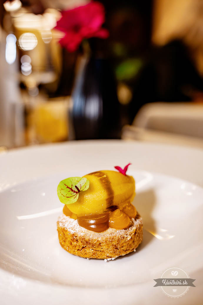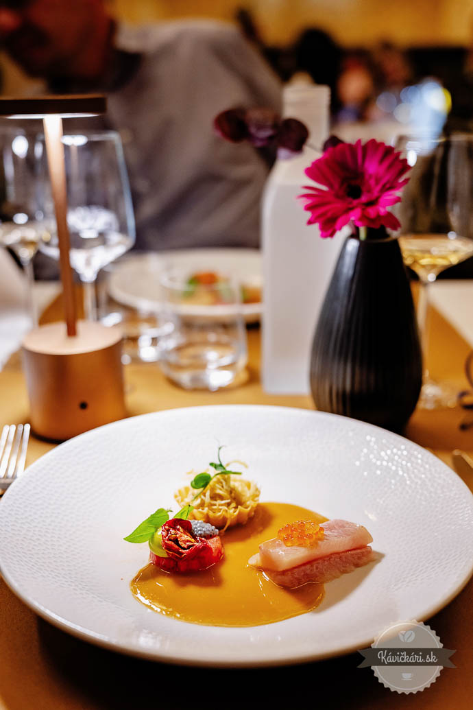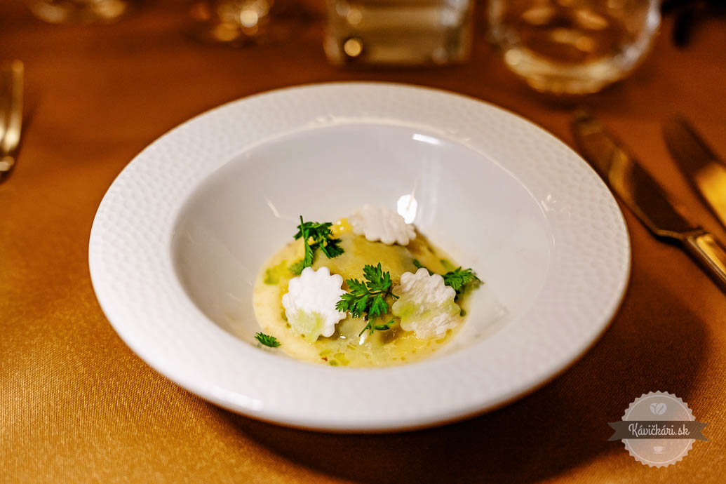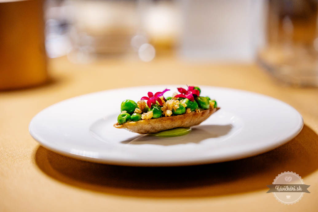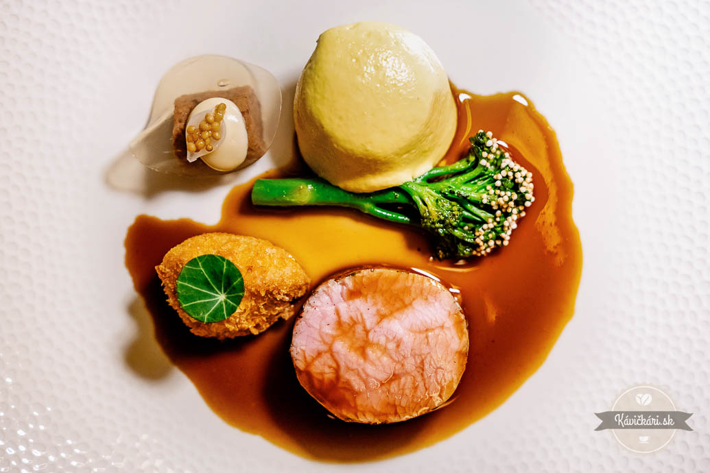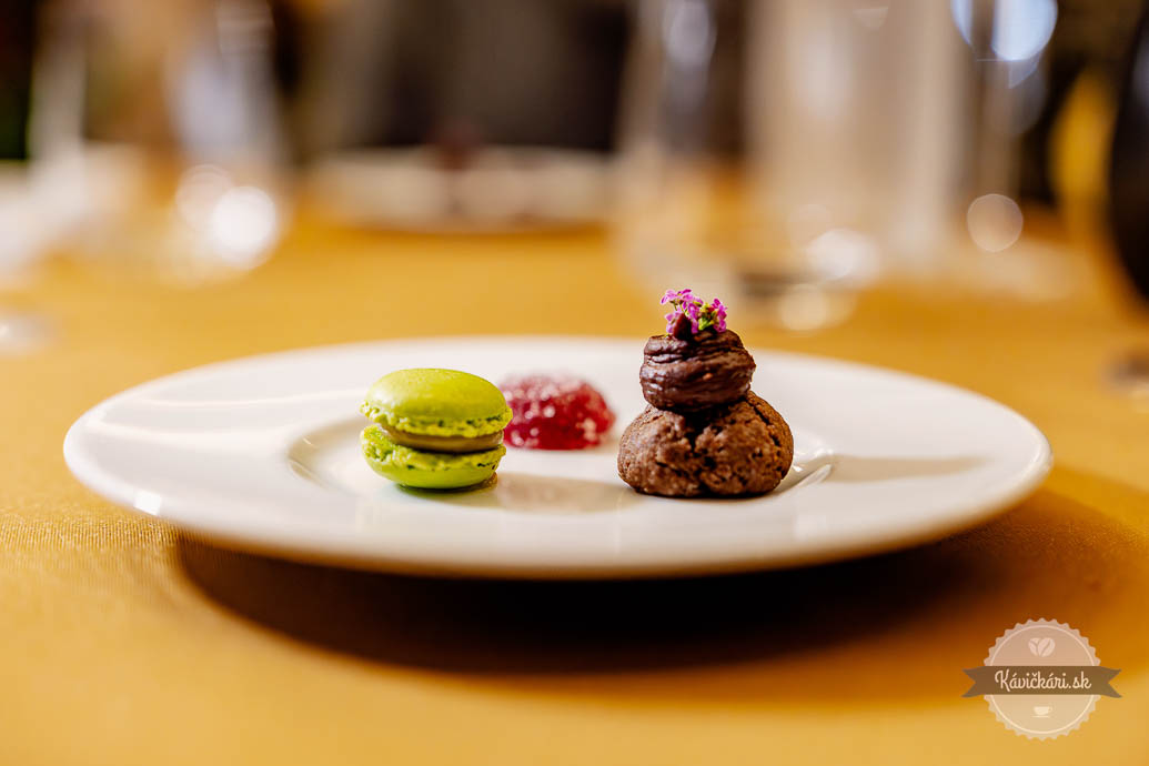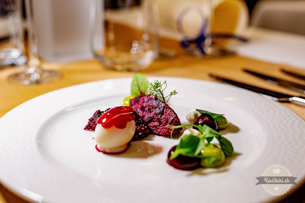 Hráškový amuse bouche striedalo predjedlo, v ktorom dominovala červená repa, vajce a kaviár. Raviola s hlivou, baklažánom, beurre blanc a bylinami bola skvelým pokračovaním. Ďalší chod bol v podobe sivoňa, rajčiaka a zemiaka. Nezaostávalo ani mäso, konkrétne teľa, brokolica, polenta a hľuzovka. Sladká bodka na záver? Dokonalý dezert s chuťami marhule, mandlí a tekvice. Ako petit fours zabodovala pistáciová makrónka, čokoladádový dezert s ganache a malinové želé.