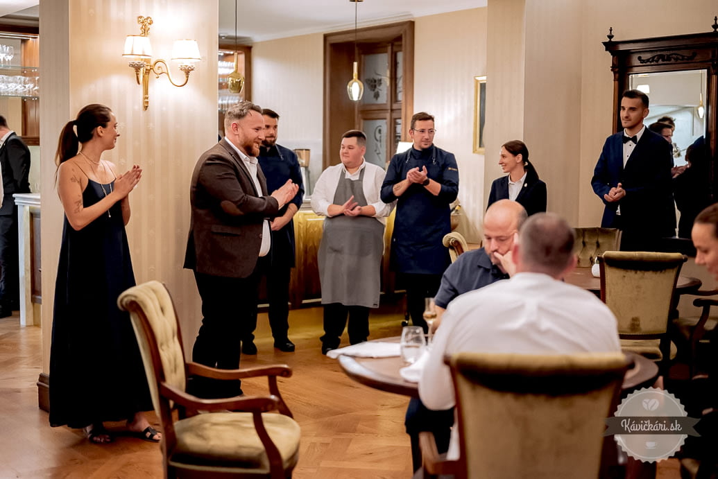 Čo sa týka nášho stolu, musím uznať, že sme získali žolíka. Mali sme totiž výhľad priamo na chef’s table. Počas celého večera sme tak mohli neprestajne sledovať majstrov priamo pri práci. Ostrieľaný profesionál Jirka Zajíček so svojím tímom sú profesionáli na slovo vzatí. Zohratosť by im mohli závidieť aj manželské páry oslavujúce diamantové výročie svadby. A to aj napriek tomu, že išlo o prvý event v novom prostredí. Na ich tímovej práce to veru badať nebolo.