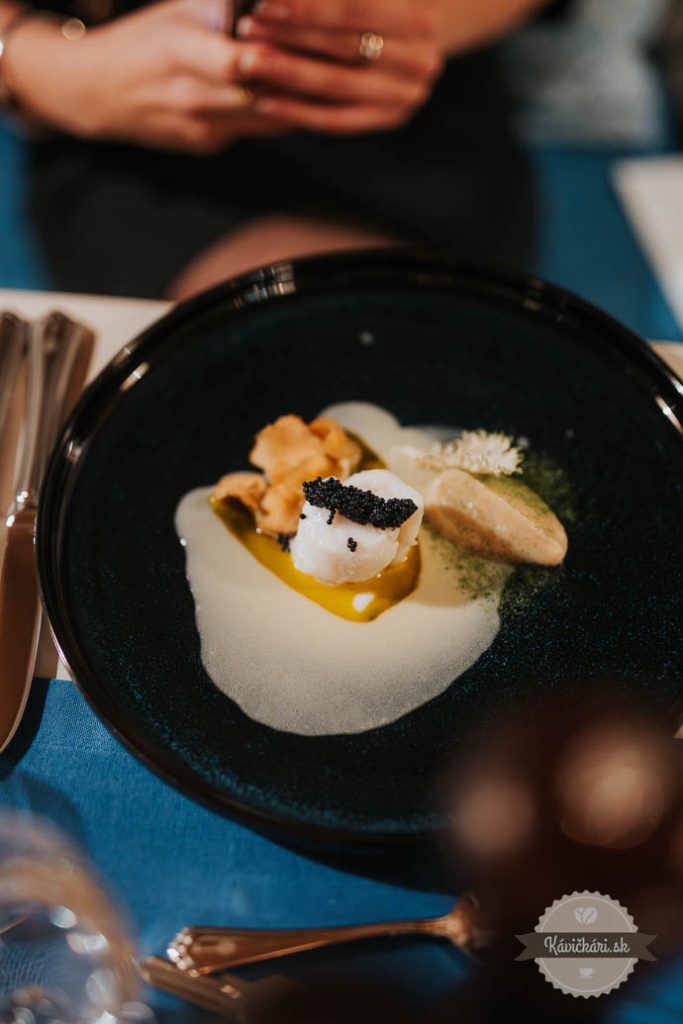 V polovici degustácie bolo vidieť, že príprave venovali potrebný čas a všetko od servisu až po výsledok išlo skvelo. Ďalší chod bol znova spojením tradície a exotiky. Líčka z morského čerta a k tomu málo využívaný ale o to zaujímavejší čierny koreň, beurre blan a kaviár z jesetera. Silné a výrazné chute si žiadali aj mohutnejšie víno a someliér Miloš Florkovič to zvládol na výbornú.
