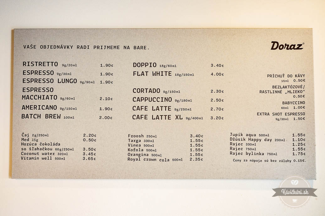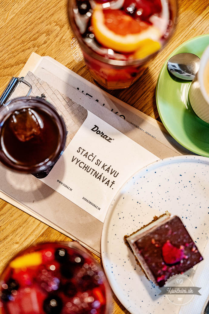 Samozrejmosťou kaviarne Doraz sú rôzne prípravy kávy a dva mlynčeky – v čase našej návštevy to bola Kenya a ich typický blend Intercity. Okrem kávy sú v ponuke aj čoraz obľúbenejšie matcha nápoje či limonády z miestnych sirupov Tvoy. Lokálne sú aj koláče a zákusky, z ktorých si vyberú aj hostia s potravinovými intoleranciami.