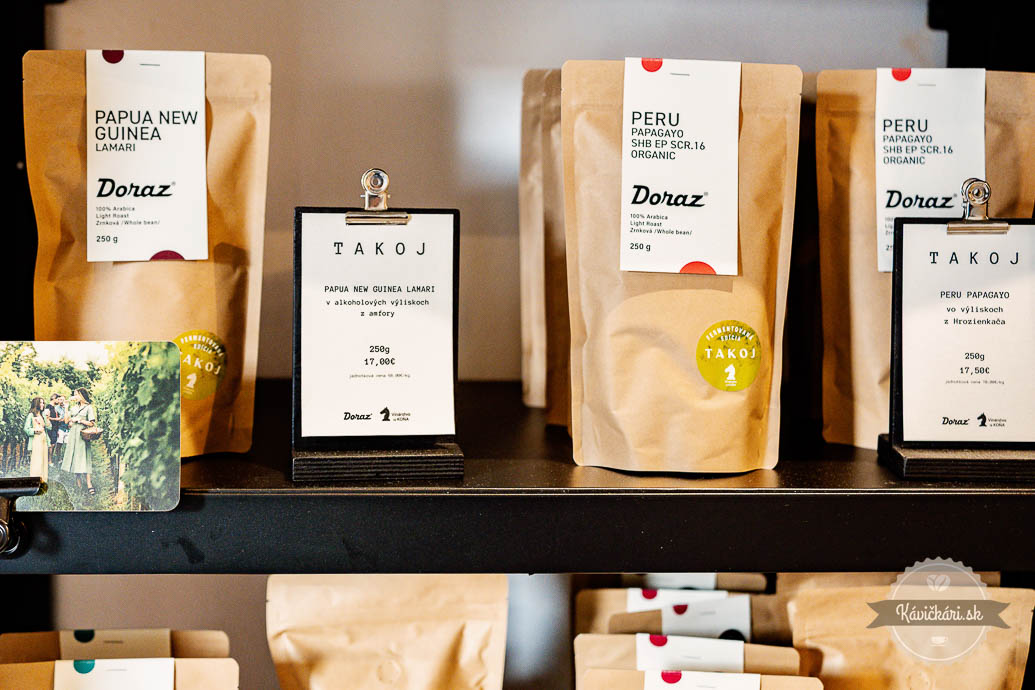 Pozornosť si zaslúži aj kávová edícia TAKOJ. Ide o rôzne arabiky, ktoré majú bežne v ponuke, avšak v spolupráci s vinárom Mariánom Takáčom z Vinárstva u KOŇA ich dodatočne fermentujú v hroznových výliskoch z rôznych odrôd vín. Ich snahou bolo spojiť sily a vytvoriť regionálny, neopakovateľný produkt. A tak zelené zrná kávy z rôznych kútov sveta ešte pred pražením fermentujú vo výliskoch z tokajského vína. Čo sú výlisky? Ide o vedľajší produkt, ktorý vzniká pri lisovaní vína. Odroda vína a jeho cukornatosť, dĺžka fermentácie, následné sušenie a praženie, to všetko vstupuje do procesu, na konci ktorého je TAKOJ. Dôkaz, že Doraz vie spájať moderné trendy vo výberovej káve s lokálnou identitou a prinášať chuťový zážitok, ktorý si rýchlo nájde cestu k milovníkom kávy nielen na východe Slovenska.