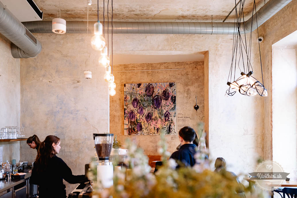 Za stolmi pri veľkých oknách, ktoré dnu vpúšťajú slnečné lúče, nájdete sedieť rodiny, turistov, študentov, ale aj kaviarenských pôžitkárov či ľudí na pracovnej schôdzke. Užívajú si nielen skvelú kávu a jedlo, ale aj priestory, ktorým dominujú 4 metre vysoké stropy, odhalené steny či zaujímavé čierne svietidlá. Tie sú inšpirované bondážou a klasickou japonskou technikou viazania a sú výtvorom Kateřiny Handlovej, ktorá ich navrhla pre skláreň BOMMA. No náš zrak upúta aj obraz, ktorý je súčasťou aktuálnej výstavy v galérii.