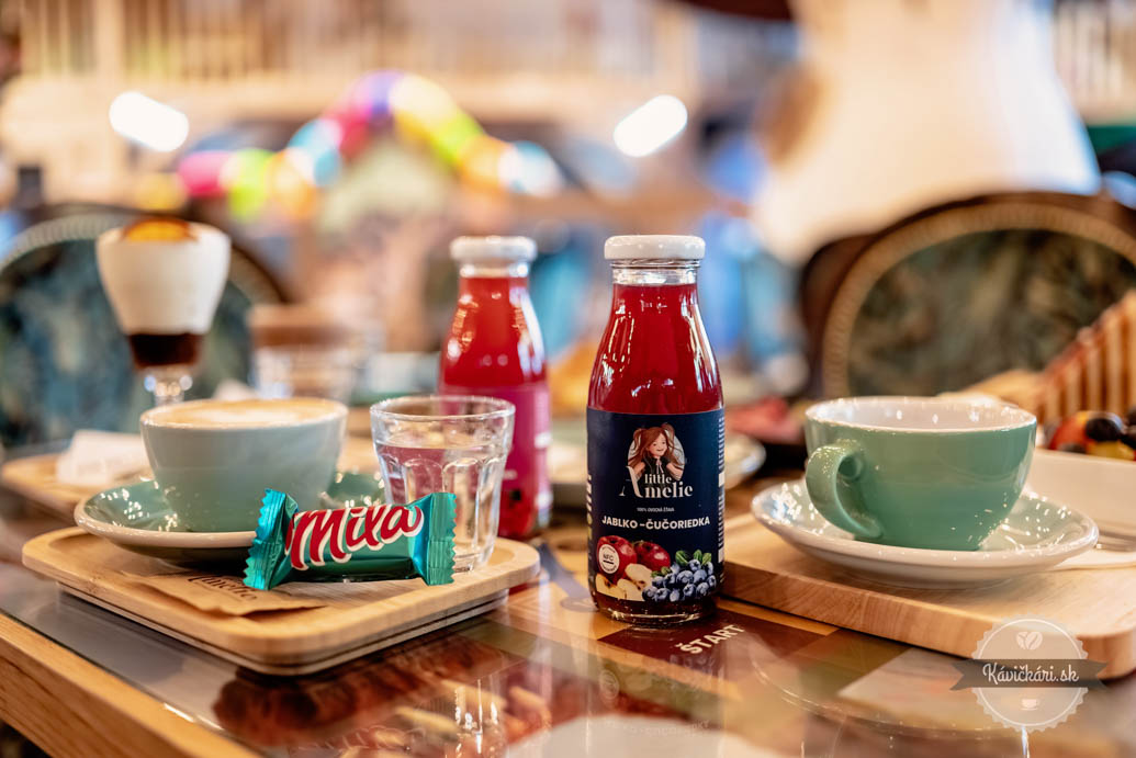 Ponuka kaviarne je ako rozprávková truhlica plná chutí, ktoré majú svoj pôvod v slovenských a českých dielňach. „Hneď na začiatku sme si stáli za tým, že chceme ponúkať predovšetkým kvalitné lokálne produkty, nie komerčné značky,“ hovorí majiteľka. Káva, ktorá nesie ich brand a rozprávkový dizajn, pochádza z pražiarne Rye Island Roastery z Dunajskej Stredy, ovocné šťavy taktiež v dizajne značky od firmy Wellberry a koláče od cukrari.sk, Purista a Floril. Kaviarnička si získa srdcia aj vďaka detailom, akými sú napríklad spomínané dizajny štiav či káv nesúcich názov a podobizeň Little Amelie. Aktuálne si v kaviarni môžete vychutnať pozornosť navyše v podobe oblátky Mini Mila, ktorú vám naservírujú ku káve.