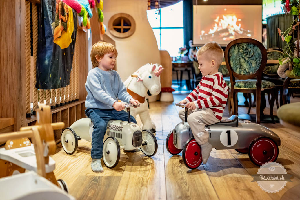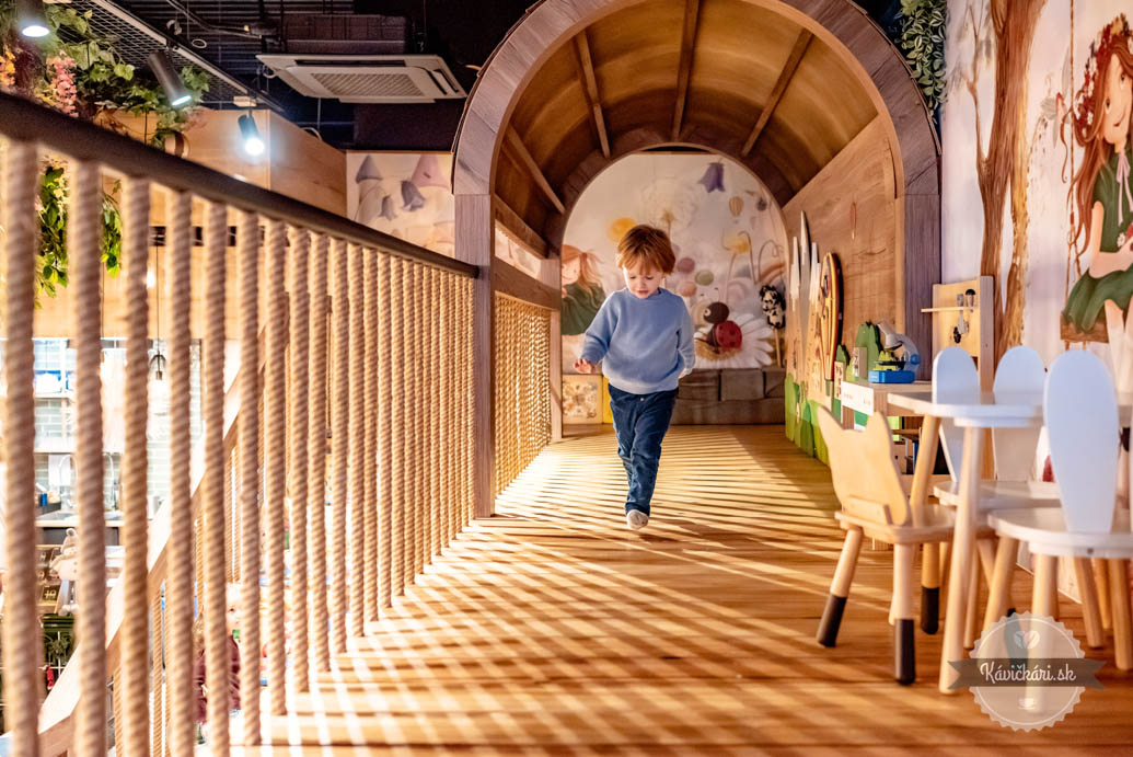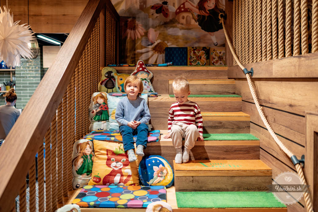Ten tvorí viac ako polovicu kaviarne a je hotovým umeleckým dielom. Drevený dizajnový kútik vyrobený na mieru ponúka množstvo zákutí, kde sa môžu deti naplno hrať, šantiť či rozvíjať svoju fantáziu a zručnosti. Všetky hračky, ktoré v kútiku nájdete, sú kvalitné, drevené či edukatívne. Nechýbajú ani aktivity panely, knihy, detské guľôčky, hojdačka, šmykľavka či detské dopravné prostriedky. Každý kúsok skrýva nové podnety na hru, no gurmánsky pôžitok nezaostáva.