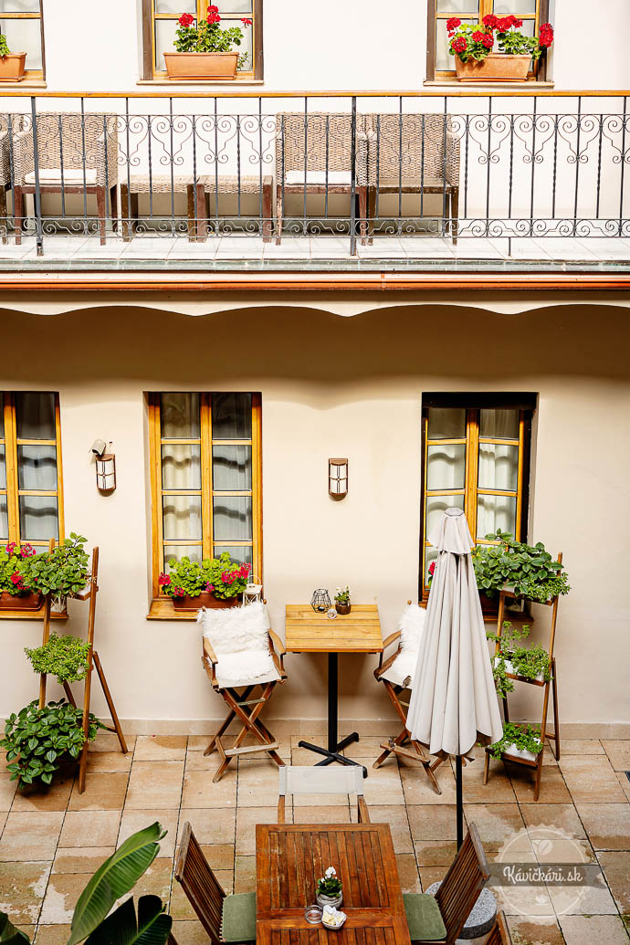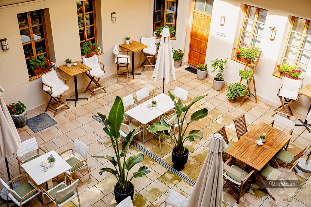 V slnečných dňoch stoja za zmienku raňajky na vnútornej terase, keďže na čerstvom vzduchu vždy chutí tak akosi inak. Tento vnútroblok je skrytým pokladom hotela. Je plný zelene, ticha a svetla, ktoré sem preniká tak akurát, aby ste sa cítili ako v súkromnej záhrade. A čo je skvelé? Kým si vy vypijete kávu, deti sa môžu prehrať v malom detskom kútiku s pieskoviskom v rohu terasy. V bezpečí štyroch stien. 🙂