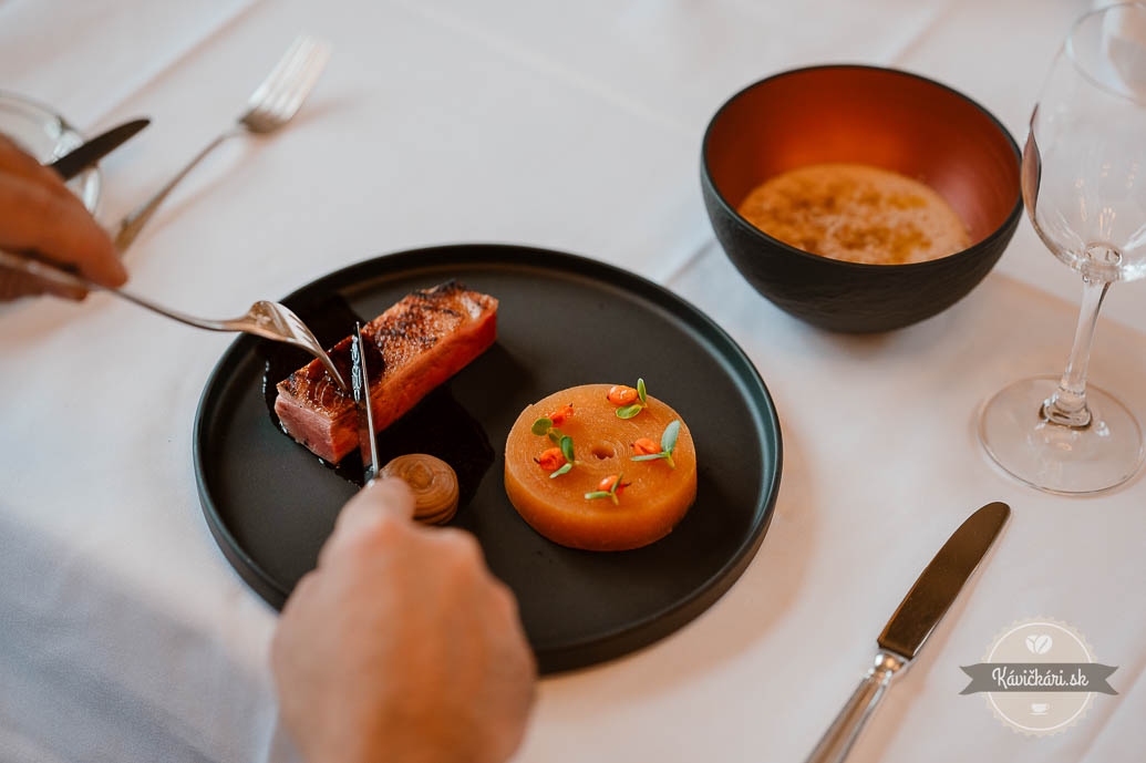 (rakytník, údená krupica, škoricové jablko, gaštanové pyré)